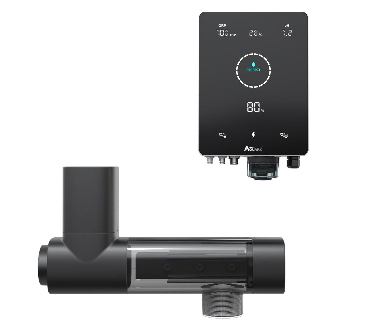 Dávkovací a řídící automat se sondami Redox a pH a s modulem pro řízení pumpy s variabilním výkonem. Regulace volného chloru a pH. Dávkování algicidu a flokulantu.